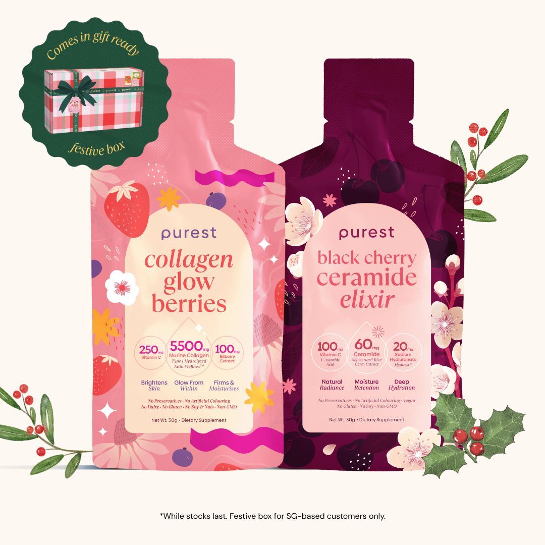 This season, glow like you mean it! Collagen Glow Berries gives your skin that youthful bounce, while Black Cherry Ceramide Elixir seals in that dewy radiance - in two easy steps you can sip in between wrapping all those presents.