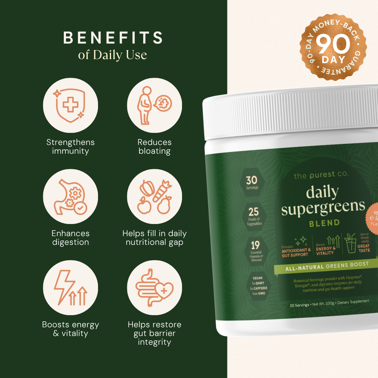 Full Ingredient List: Isomalto-oligosaccharide, Apple Juice Powder (10.4%), Vitamin Mineral Premix (Vitamin A Acetate, Cholecalciferol, D-Biotin, Folic Acid, Niacinamide, D-Calcium Pantothenate, Thiamin HCl, Cyanocobalamin, Riboflavin, Pyridoxine HCl, Sodium Ascorbate, Dicalcium Phosphate Anhydrous, Potassium Iodide, Ferric Pyrophosphate, Magnesium Oxide, Sodium Phosphate, Sodium Selenite, Zinc Oxide), FIBERLIGO™ (Resistant Dextrin), Vitamin C, Wheat Grass Powder, Barley Grass Powder, Oxxynea® (Green Olive Leaf Extract, Grape Seed Extract, Pomegranate Extract, Green Tea Extract, Grapefruit Extract, Bilberry Extract, White Grape Extract, Red Grape Extract, Citrus Hesperidin) (1.6%), Benegut® Perilla Frutescens Leaf Extract, Enzyme Premix (α-galactosidase, Proteases II, Lactase, Pectinase, Cellulase, Xylanase, Invertase, Lipase, Papain, Catalase, Proteases, Hemicellulase, Glucanases, Bromelain, Amylases, Phytase, Diastase), Spirulina Powder, Alfalfa Grass Powder, Selenium, Chlorella Powder, Mixed Vegetables Powder (Spinach Powder, Pumpkin, Carrot Powder, Purple yam Powder, Burdock Powder), Mixed Fruits Juice Powder (Orange juice powder, Pineapple Juice powder, Mango juice powder, Passion fruit juice powder), Chromium, Lemon Flavour, Sucralose