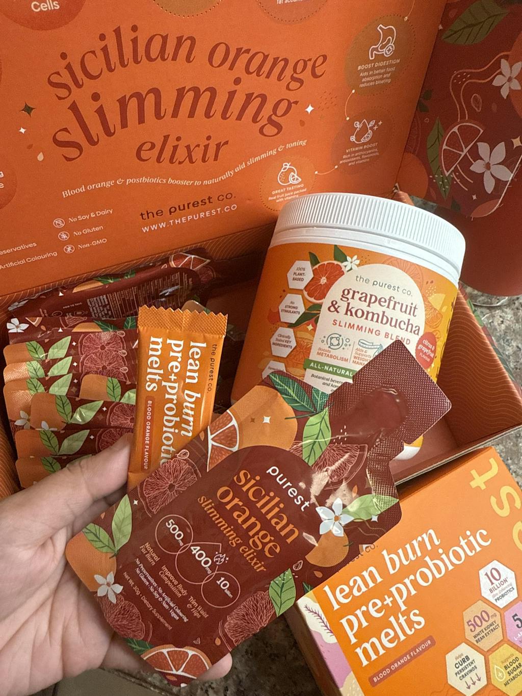 From a scoop of Grapefruit & Kombucha Slimming Blend in the morning to a sachet of Sicilian Orange Slimming Elixir before dinner (and a mouthful of Lean Burn Pre+Probiotic Melts in between), this bundle presents an easy and effortless way to stay on track towards your #BestBody ever.