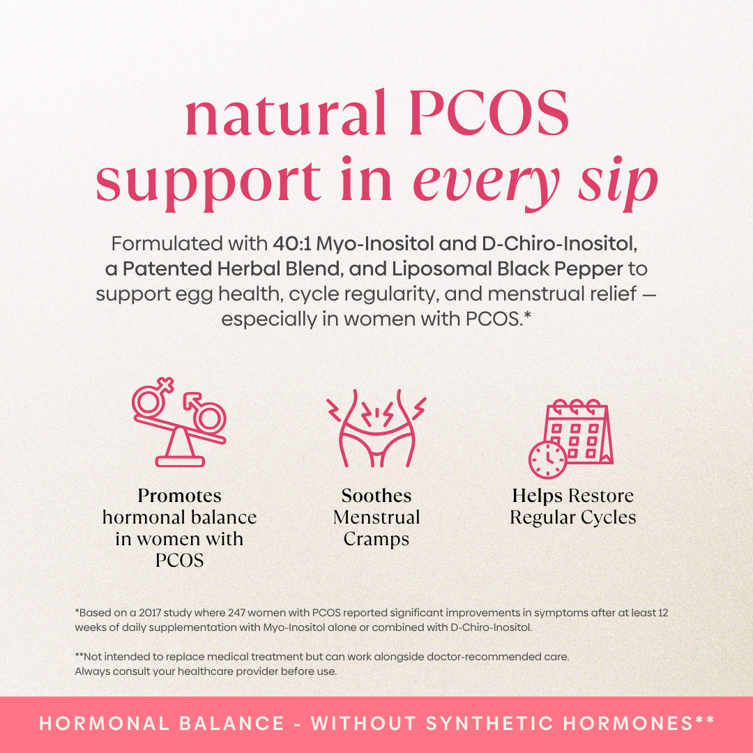 A science-backed blend of inositols and herbal extracts crafted to support hormonal balance, cycle regularity, and period relief— especially in women with PCOS.